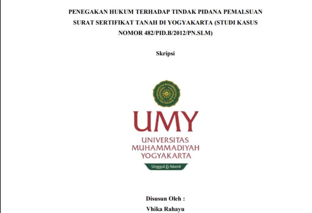 - VHIKA RAHAYU (2021) – Studi kasus dari Universitas Muhammadiyah Yogyakarta menyoroti pemalsuan surat sertifikat tanah yang melibatkan penggunaan fotokopi sebagai dasar pembuatan dokumen palsu.