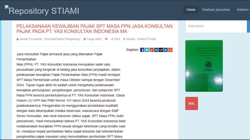 Studi pertama berasal dari penelitian Dhaffa Tri Ananda (2025) dari Institut STIAMI yang berjudul “Pelaksanaan Kewajiban Pajak SPT Masa PPN Jasa Konsultan Pajak pada PT YAS Konsultan Indonesia”. Penelitian ini menyoroti bagaimana perusahaan konsultan pajak yang berstatus PKP menjalankan kewajiban perpajakannya, terutama terkait penerbitan faktur pajak, penentuan DPP, serta pelaporan SPT Masa PPN. Temuan penelitian tersebut menegaskan bahwa kepatuhan bukan hanya bergantung pada perhitungan pajak, tetapi juga kemampuan administrasi, akurasi dokumen, dan sistem internal yang mendukung pelaporan digital.