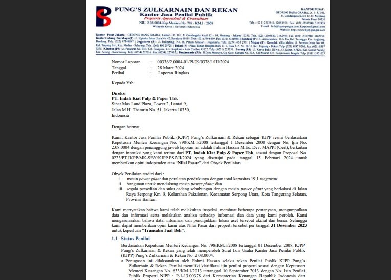 Sebagai contoh, laporan penilaian properti PT Indah Kiat Pulp & Paper Tbk menunjukkan bahwa KJPP menggunakan pendekatan biaya dan pasar sesuai dengan KEPI dan POJK 28/2021, serta menyertakan asumsi-asumsi penting dalam perhitungan nilai pasar.