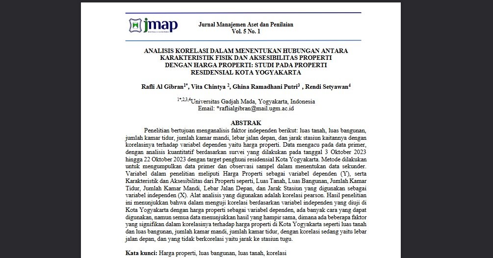 Secara keseluruhan, penelitian ini menegaskan bahwa karakteristik fisik still menjadi elemen paling penting dalam pembentukan harga properti. Selain itu, hasilnya dapat menjadi rujukan bagi investor, pengembang, dan penilai properti untuk memahami dinamika pasar residensial di Yogyakarta.