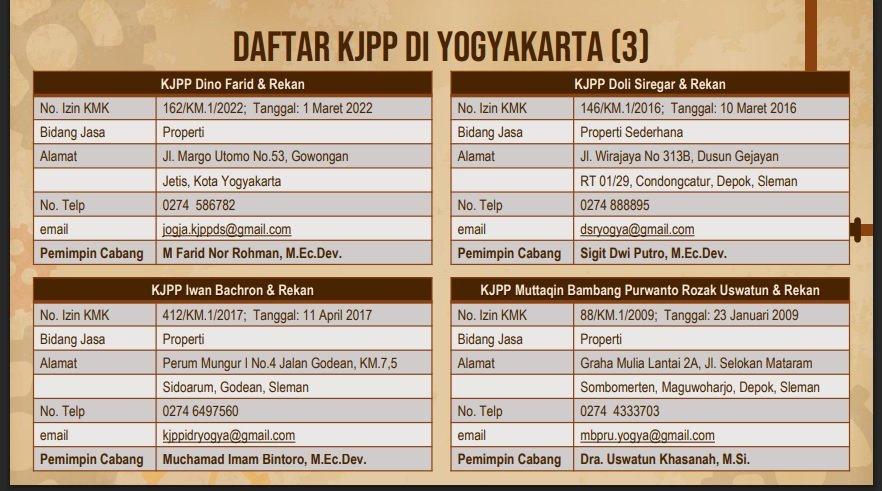 | 4 | KJPP Aditya Masroni Nur Rahman Anizar Hadiyanto & Rekan | Terdaftar sebagai KJPP resmi di DIY. |