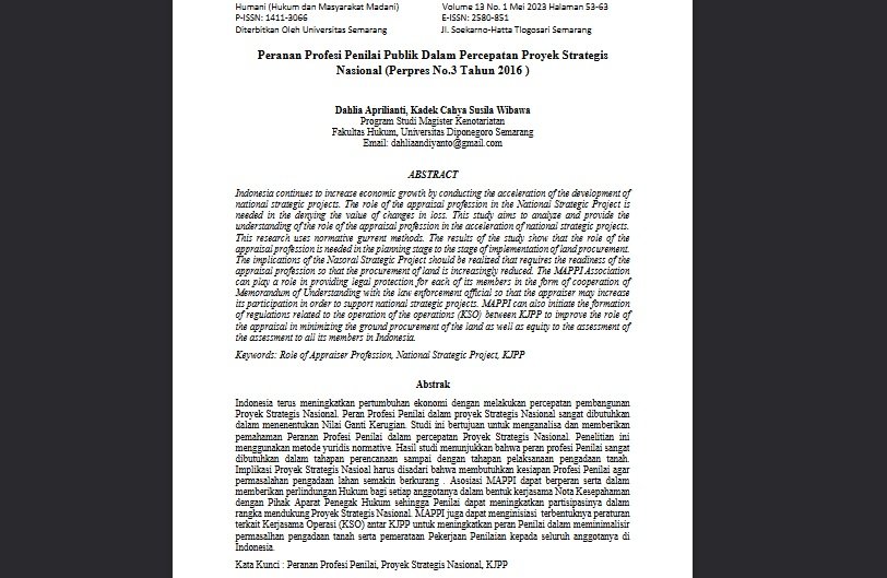 Penelitian ini ditulis oleh Dahlia Aprilianti dan Kadek Cahya Susila Wibawa, diterbitkan pada 2023 sebagai kajian hukum dan kebijakan publik mengenai percepatan pembangunan infrastruktur di Indonesia. Penulis menyoroti peran profesi Penilai Publik dalam mendukung proses pengadaan tanah untuk Proyek Strategis Nasional (PSN) sesuai ketentuan Perpres No.3 Tahun 2016.