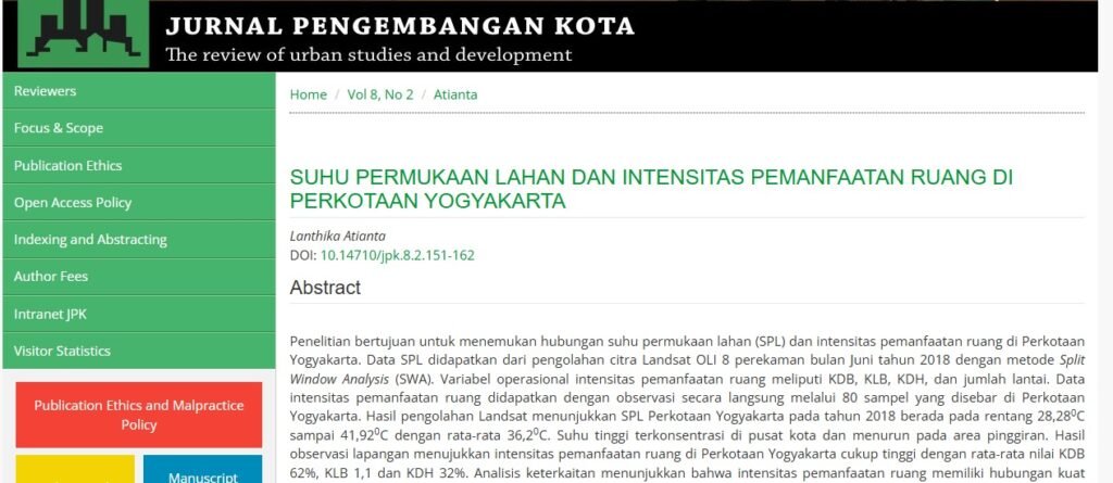 Suhu Permukaan Lahan dan Intensitas Pemanfaatan Ruang di Perkotaan Yogyakarta.