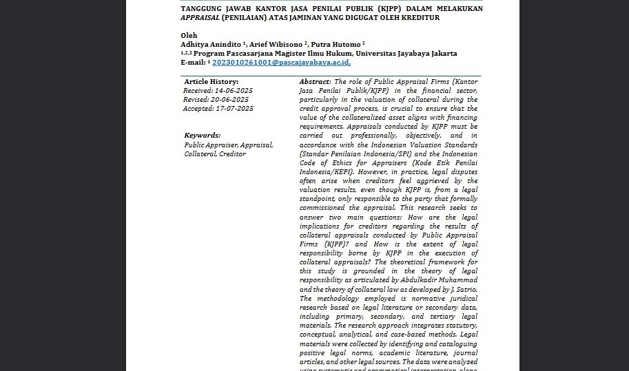 Penelitian oleh Hendra Santoso, berjudul “Tanggung Jawab Kantor Jasa Penilai Publik (KJPP) dalam Penilaian Agunan yang Digugat oleh Kreditur” dan diterbitkan di Jurnal Ilmu Riset Keuangan (2023), menyajikan analisis mendalam tentang kewajiban hukum KJPP terhadap pemesan penilaian serta implikasinya bagi kreditur yang dirugikan.