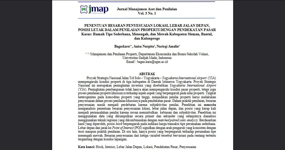 Bagaskara, Anisa Nurpita, dan Nurisqi Amalia dari Universitas Gadjah Mada menulis penelitian berjudul ‘Penentuan Besaran Penyesuaian Lokasi, Lebar Jalan Depan, Posisi Letak dalam Penilaian Properti dengan Pendekatan Pasar: Kasus Rumah Tipe Sederhana, Menengah, dan Mewah Kabupaten Sleman, Bantul, dan Kulonprogo.’ Artikel ilmiah ini terbit pada tahun 2021 dalam Jurnal Manajemen Aset dan Penilaian (JMAPPI).