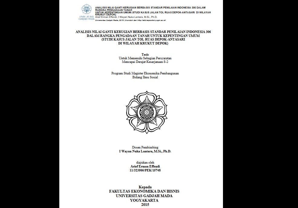 Penelitian berjudul “Analisis Nilai Ganti Kerugian Berbasis Standar Penilaian Indonesia 306 dalam Rangka Pengadaan Tanah untuk Kepentingan Umum (Studi Kasus Jalan Tol Ruas Depok–Antasari di Wilayah Krukut, Depok)” oleh Arief Erman Effendi dan I Wayan Nuka Lantara (ETD UGM) menunjukkan penerapan nyata prinsip SPI.