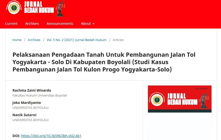 Berdasarkan hasil penelitian, pelaksanaan pengadaan tanah di Kabupaten Boyolali telah sesuai dengan UU No. 2 Tahun 2012 dan Perpres No. 19 Tahun 2021. Masyarakat perlu memahami tahapan serta hak atas ganti rugi agar tidak terjadi kesalahpahaman.