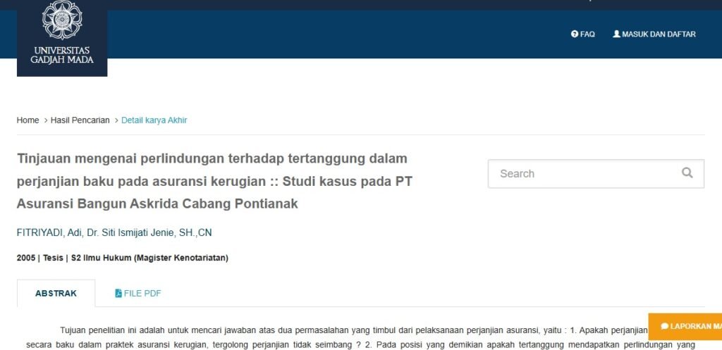 Tesis Magister UGM tentang perjanjian baku dalam asuransi kerugian menyoroti posisi tawar tertanggung. Jika polis tidak menjelaskan apakah dasar klaim menggunakan Nilai Pembangunan Kembali atau nilai aktual, potensi sengketa sangat besar.
